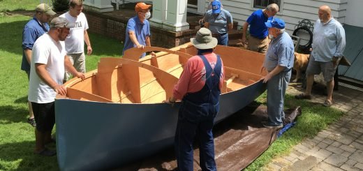 A twenty foot boat seems even bigger at turnover time. Dave Spondike rustled up a crew of CABBS members and some of his ham radio club friends to help get the hull of his Phil Bolger designed Chebacco, named MEYG after his grandmother, turned over so he can get started on the interior.