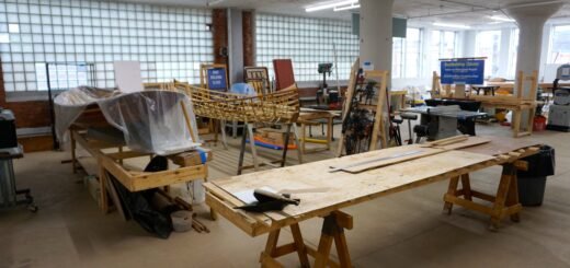 Ed nearly completed all the paint and varnish work before the weather turned cold and he could no longer work in his barn loft workspace. In the meantime, he turned his attention to the oars, crafting the ten footers out of spruce. He based the oars on a Pete Culler design and estimates each oar will weigh about a pound and a half more than a carbon-fiber off-the-shelf equivalent, yet cost 1/20th the price.